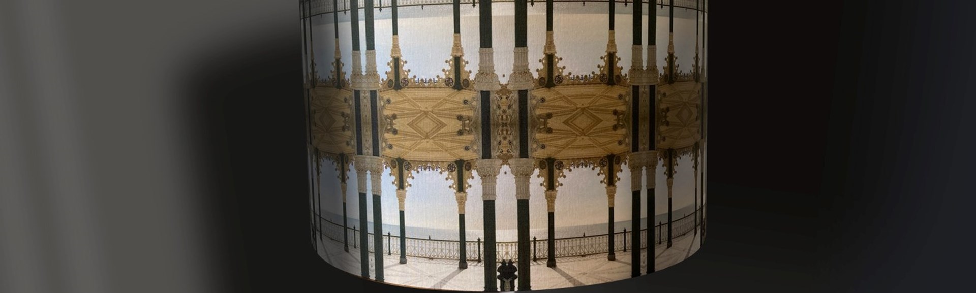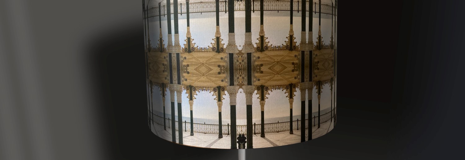 Your shade fabric is designed by me, using my own photography I photographed a Victorian bandstand, whilst strolling along the Brighton Promenade. The classic colours of the sky, the sun, sea in the background, with the beautiful lines of the bandstand, framing this view with its light browns and blacks. The sun is starting to set and the shadows get longer, adding a grey tone into the fold.